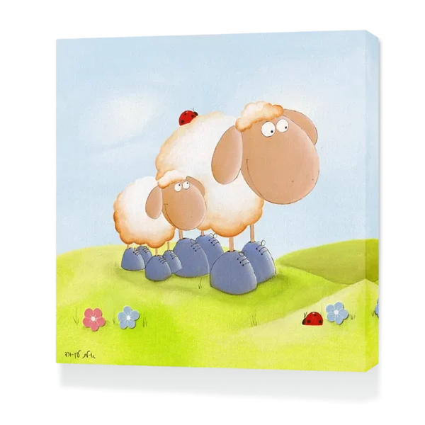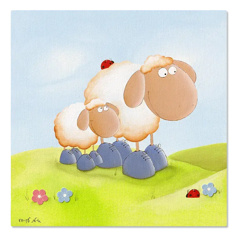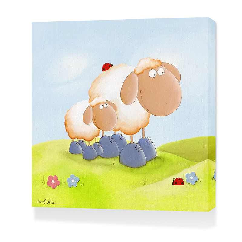 תמונת הקנבס כבשים היא חלק מסדרת ציורים מרגשת של חיות על דשא רענן, מוקפות בפרחים וחיפושיות. החיות מאושרות ומחייכות זה לזו וניכר שהן נהנות מהבילוי המשותף. התמונות מעבירות תחושת אהבה, חמימות וקסם. רקע השמיים והעננים הלבנים משדרים רוגע ושלווה.
